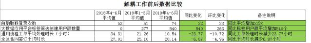 自我支撑比例是衡量一线是否可以不用借助其他部门就可以实现自己查询所需各项资源、数据与报表,经系统统计,全区系统自助取数登录月平均次数由2018年的52次增加至74次,同比增长42%;全区大数据应用平台标签筛选创建用户群数量由2018年的0个增加至540个;全区通用流程工单月平均处理时长由2018年的平均34.31小时降低至平均10.54小时,同比降低69%;全区合同签订平均时长由2018年的27.01工作小时减少至20.14工作小时,平均减少6.87工作小时,解耦工作实施效果较为显著。
