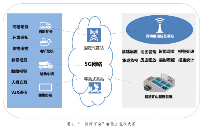 以5G工业定制网络为载体,满足工业海量大连接、高可靠低时延控制、高容量大带宽连接的智能工业场景需求,以管理、业务为切入点,打造“一网两平台”的智能工业模式,如图4所示。