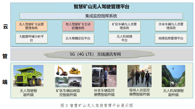 项目总体为“云-管-端”架构,平台分为业务、存储和运营等三个域。通过打造4/5G专网以及将指挥系统部署在本地私有云平台,从而加强安全性,提高系统运转效率,为前端无人驾驶应用提供保障。图3以“云-管-端”架构剖析智慧矿山无人驾驶管理平台。