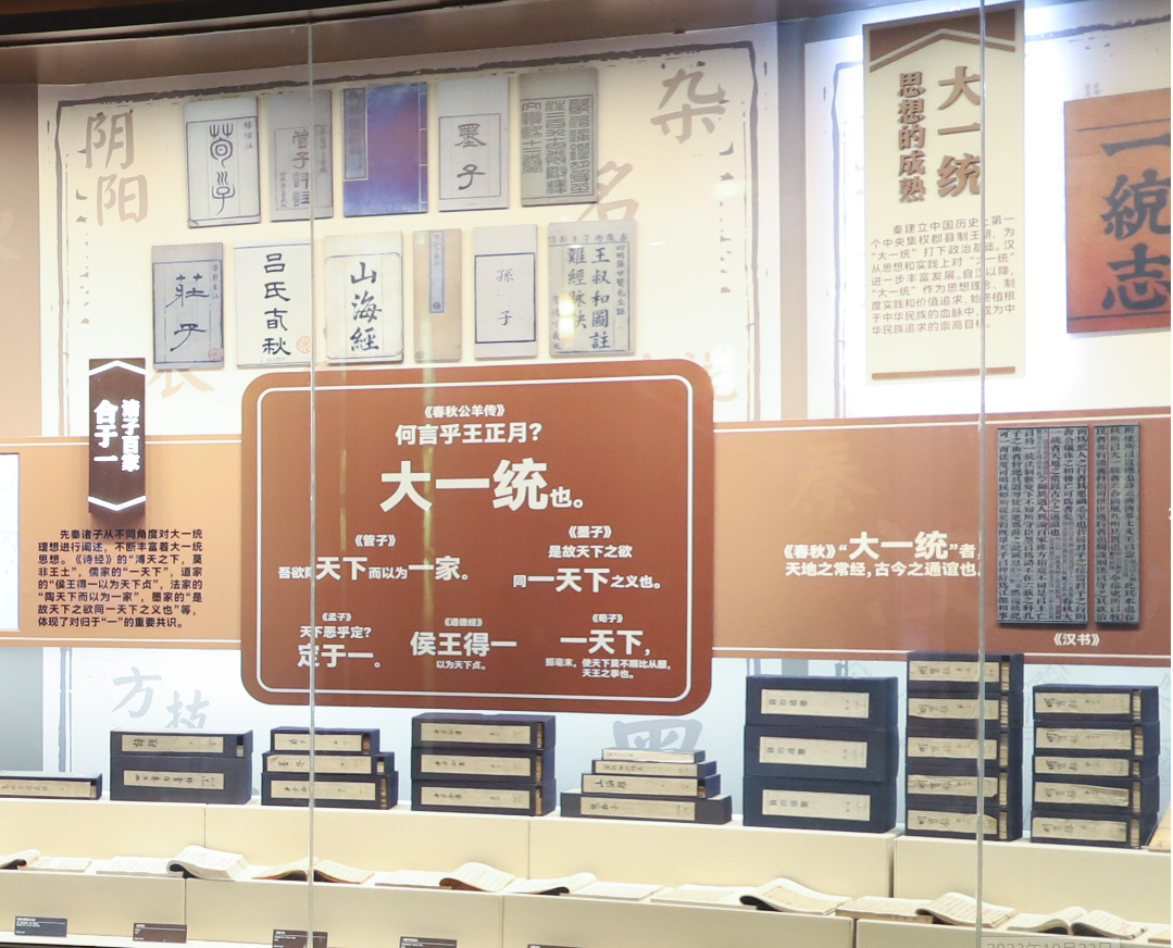 ▲国家民委主办的铸牢中华民族共同体意识文物古籍展“大一统”单元,展示了大量记录“大一统”历史的古籍。石建杭摄