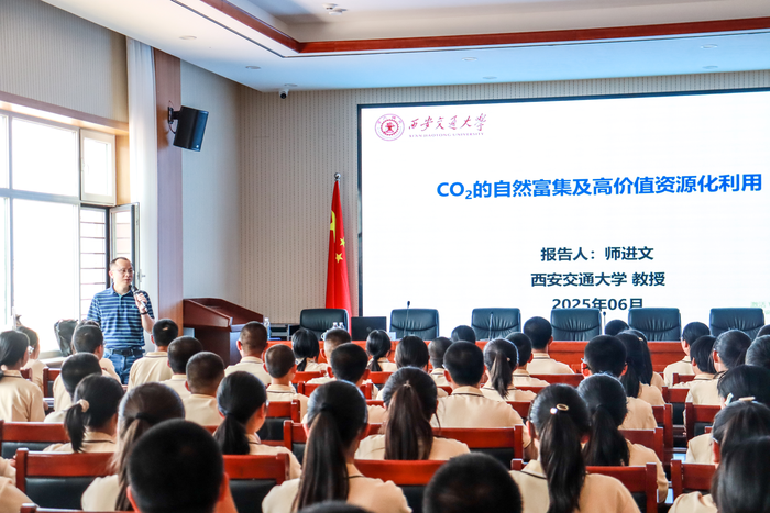 西安交通大学绿色氢电全国重点实验室教授、博士生导师师进文带来一场题为《CO₂的自然富集及高价值资源化利用》的专题报告。师进文教授用鲜活案例破解复杂原理,配合动画演示和科研实景图片,抽象的验室成果变得直观可感,同学们神情专注,眼中闪烁着对绿色科技的向往。