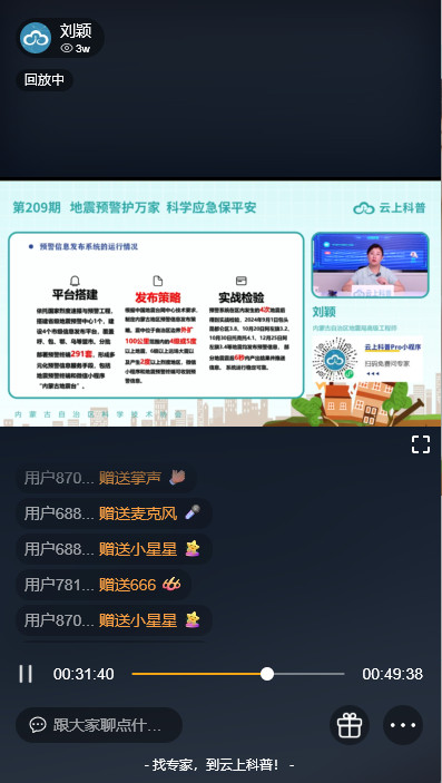 直播中,内蒙古地震局高级工程师刘颖作为主讲人,围绕我国和区内地震分布概况、地震预报与地震预警、如何科学应对地震等内容进行了深入浅出的讲解。她结合专业知识和实际案例,为观众详细剖析地震预警相关知识,还通过生动形象的科普动画展示,将复杂的地震原理和预警机制以直观易懂的方式呈现出来,增强了观众的理解和记忆,助力大家提升防震减灾意识与应急能力。