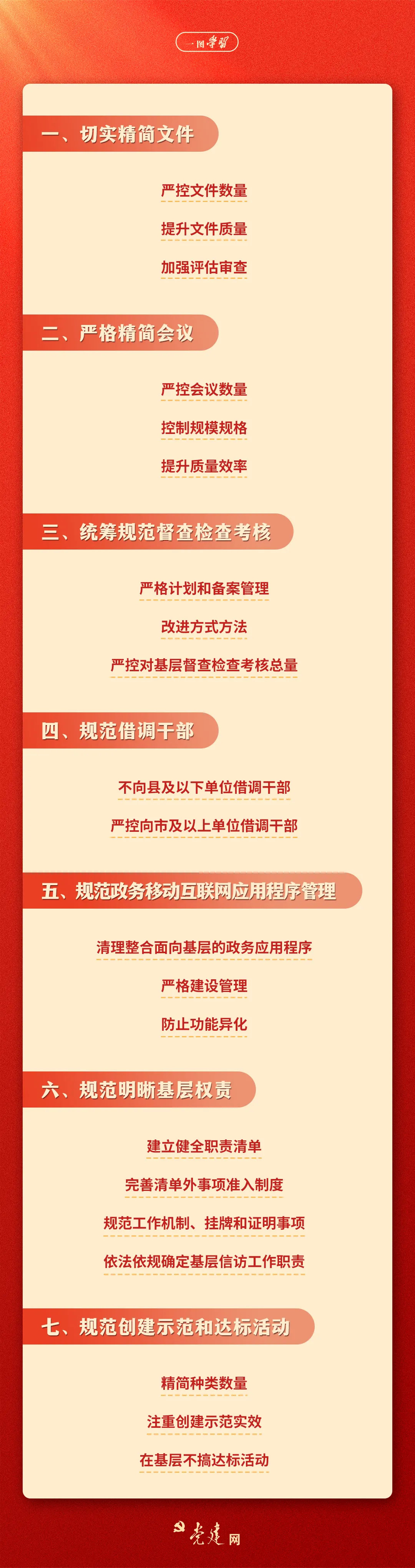 中共中央办公厅、国务院办公厅印发《整治形式主义为基层减负若干规定》(以下简称《若干规定》),并发出通知,要求各地区各部门认真遵照执行,统筹为基层减负和赋能,切实把基层从形式主义、官僚主义束缚中解脱出来,引导广大党员、干部积极担当作为,有更多精力抓落实。《若干规定》都有哪些明确要求?快来一图学习!