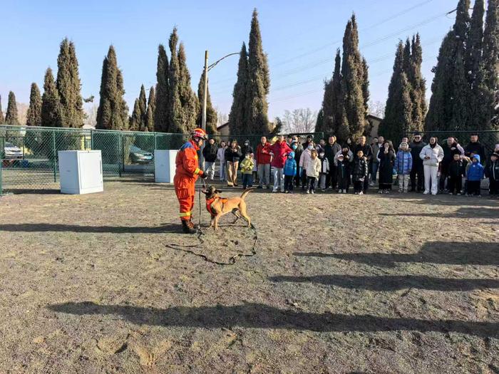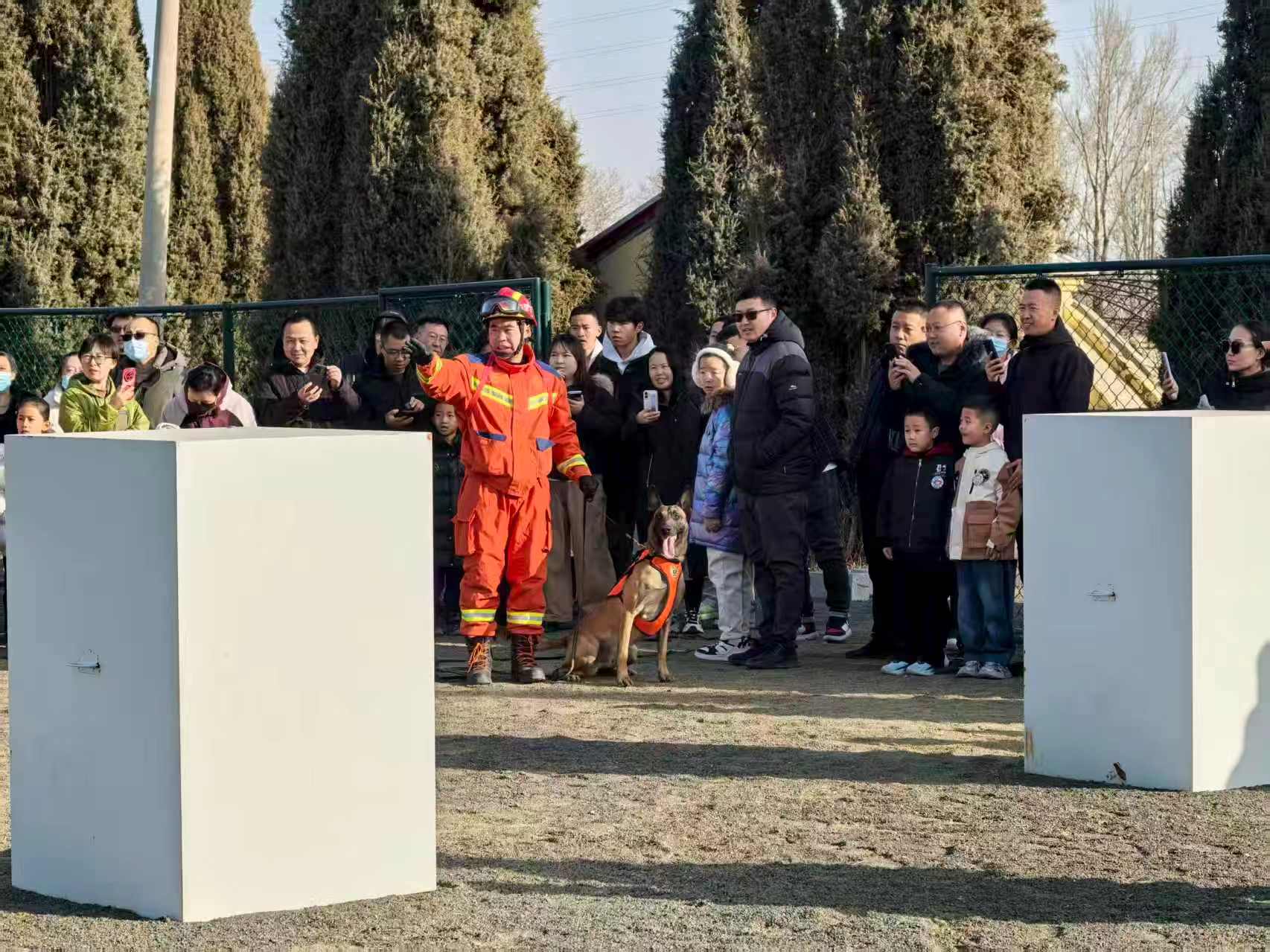 活动现场,消防指战员首先为孩子们发放《搜救犬知识手册》,并组织大家观看消防搜救犬救援纪实短片,生动再现搜救犬在灾害现场的“尖兵”作用。在模拟倒塌建筑场景中,搜救犬通过精准嗅探快速定位“被困者”的演示,让孩子们更加直观地感受到其敏锐的嗅觉与专业素养。随后,消防指战员还现场展示搜救犬“坐、卧、搜”等基础训练科目,讲解服从性训练对执行救援任务的重要性。活动最后,孩子们在消防员的引导下,轻柔抚摸搜救犬背部,近距离感受这些“无言英雄”的温顺与忠诚。同学们纷纷表示:“通过这次活动,不仅学到了消防知识,更明白了搜救犬在救援中不可或缺的作用,它们真是太了不起了!”