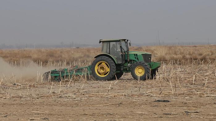 在农田里,随着机车匀速前进,一排排金属耙齿精准在土地中划过,所过之处,残留于地表甚至浅层土壤中的废旧农膜被一一“打捞”出来。在完成初步的拾翻处理后,从田间清理出来的残膜进入集中化、资源化处理环节。