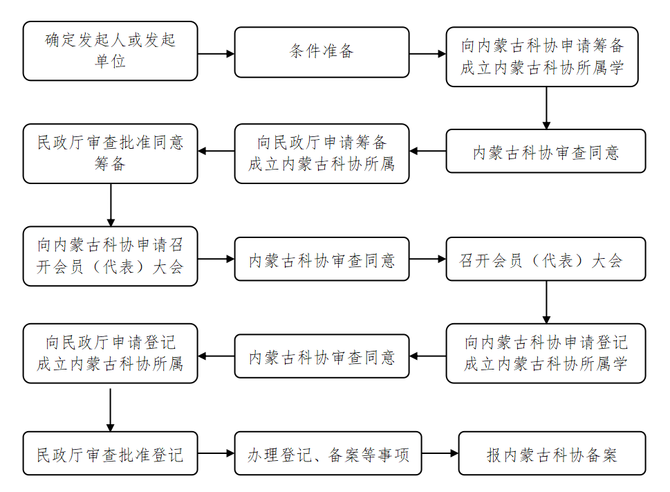 需提交的材料 | 1.《筹备成立内蒙古科协所属学会申请表》及电子版; 2.学会章程草案(依照《民政厅社会团体章程范本》制定); 3.住所使用权证明(自拟。须由提供住所的单位或个人出具的使用证明,并提供房屋产权证复印件,若为租赁的,提供租赁合同复印件); 4.注册资金来源单位或个人的捐资证明(自拟,写明拟捐赠金额、作为拟成立的该学会的活动资金,承诺该资金为捐赠者的合法财产,捐赠人签字或者捐赠单位盖章); 5.《拟任负责人审批表》(负责人包括理事长、副理事长、秘书长和监事长,每人一表; 6.《自治区级学会负责人汇总表》; 7.会员名单(个人会员应列出姓名、工作单位、职称、职务、联系电话及本人签字,所在单位盖章,单位会员应列出单位名称、地址、法定代表人和联系电话,加盖单位印章); 8.秘书长专职承诺书(承诺在社会团体成立后专职从事秘书长工作,不再担任其他社会职务,本人签字,加盖本人所在单位人事部门印章); 9.拟成立学会简介;(包括学会名称的解释、所在学科领域介绍、成立的必要性及可行性、学会负责人任职简况、注册资金等情况,2000字以内) 10.《社会组织党建工作承诺书》拟成立的党组织方案; 11.关于申请由内蒙古科协作为业务主管单位的请示(上述材料合格后提交) |