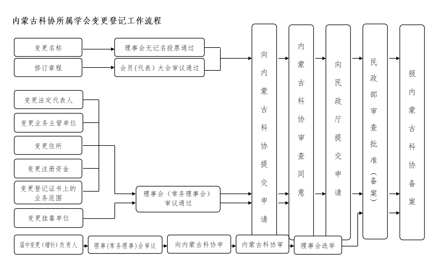 需提交的材料 | 一、拟任人选报批 1.《关于××××学会变更(增补)×××人选的请示》(红头,标明文号、联系人、联系电话。注明变更或增补理由、理事会或常务理事会审议情况、具体变更或增补人选等); 2.《内蒙古科协所属学会拟任负责人审批表》及身份证明复印件; 3.现有《学会负责人汇总表》 4.《党政干部兼任社会组织审批表》 5.理事会会议纪要(加盖学会印章)。 二、负责人变更(增补)后的备案 经内蒙古科协批准,按学会章程进行民主选举后,提交以下备案材料: 4.《社会团体负责人变动申请表》; 5.《社会团体负责人备案表》; 6.理事会会议纪要及签到表(加盖学会印章)。 注意:仅涉及届中负责人辞职、免职或秘书长聘任、解聘的不需要事前报批,履行完学会内部民主程序后到内蒙古科协备案,参照变更(增补)备案材料。 |