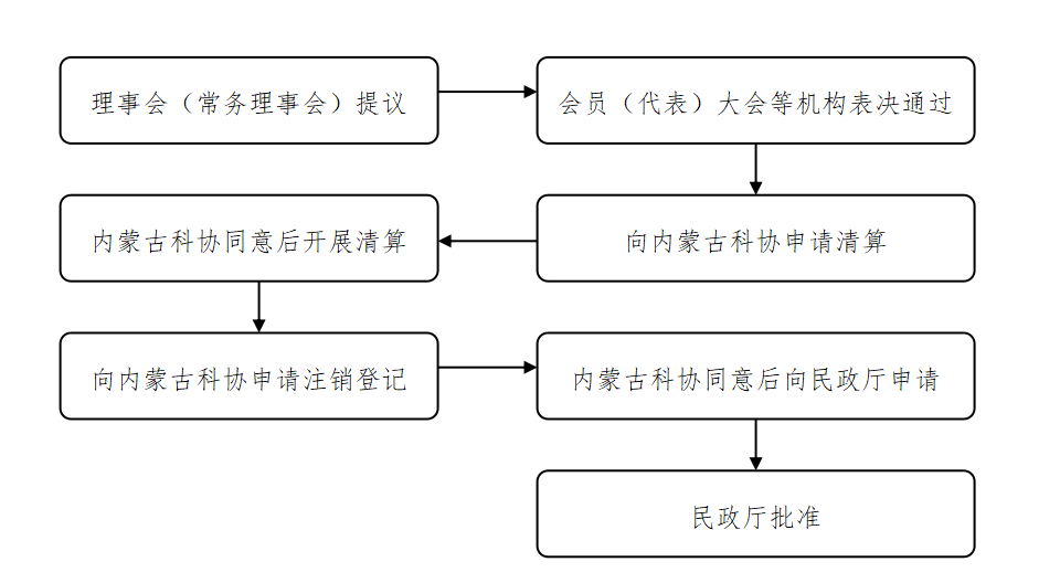 需提交的材料 | 一、申请清算时需提交: 1.《关于注销××××学会并进行清算的请示》(应标明文号、签发人、联系人、联系电话。说明申请注销的原因、会员(代表)大会表决情况及其他需要说明的问题); 2.会员(代表)大会会议纪要或总结报告(加盖学会印章); 二、申请注销登记时需提交: 3.《关于××××学会申请注销登记的请示》(说明注销登记的原因、清算情况以及其他需要说明的重要事项,法定代表人签字并社会团体盖章); 4.内蒙古科协同意注销登记的批复(写明同意注销并认可清算结果和剩余财产的处理,加盖国徽章); 5.《社会团体法人注销申请表》; 6.会计师事务所出具的社会团体清算审计报告; 7.社会团体清算报告书(清算小组成员签字)、债权债务公告(公告需刊登在公开发行的报纸上。提交报纸原件); |