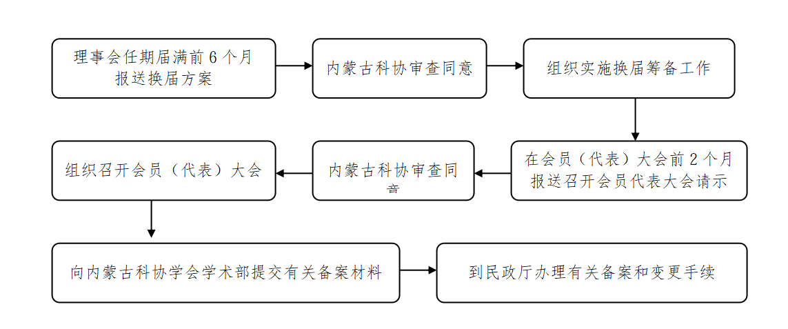 需提交的材料 | 1.换届方案(包括时间、地点、届次,会员代表规模、组成原则和会员代表产生办法,理事会、常务理事会、监事会的规模、组成原则、人选条件、名额分别和产生办法,学会负责人的规模,组成原则、人选条件及产生方式,换届组织领导机构情况,换届大会选举方式、筹备进度安排等); 2.理事会会议纪要及签到表(加盖学会印章)。 |