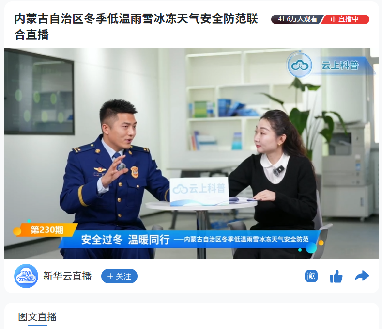 为切实提升公众在极端天气下的安全防范意识、风险辨识能力与自救互救技能,有效预防和减少冬季各类安全事故及次生灾害发生,1月16日,以“安全过冬 温暖同行”为主题的冬季低温雨雪冰冻天气安全防范联合直播活动在内蒙古科协“云上科普”平台正式启动。本次活动特邀气象、交通、消防三大领域的权威专家,在线普及关键安全知识,助力公众平安过冬。
